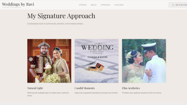 Elegant portfolio showcasing wedding photography and videography.